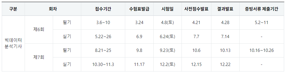 빅분기는 필기/실기로 나뉘어 일 년에 2회씩 실행한다.
